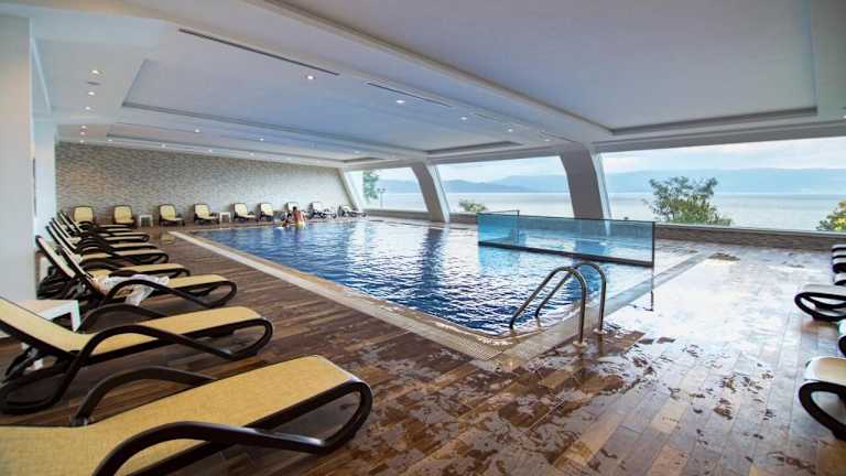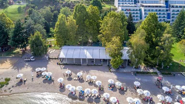 Das Hotel Izgrev Spa & Aquapark in Struga bietet Ihnen einen unvergesslichen Aufenthalt am Ufer des Ohridsees. Genießen Sie kostenfreien Zugang zum Aquapark und entspannen Sie sich in den Innen- und Außenpools. Das Hotel verfügt über komfortable Zimmer mit Balkon und Seeblick. Das hoteleigene Restaurant verwöhnt Sie mit einer Auswahl an traditionellen und internationalen Gerichten. Nutzen Sie auch den kostenfreien Zugang zum Wellnesscenter mit Sauna, Dampfbad, Hamam und Fitnesscenter. Weitere Annehmlichkeiten wie ein Tennisplatz, Minigolf und ein Konferenzzentrum machen Ihren Aufenthalt komplett.