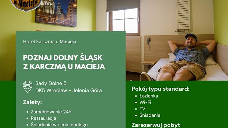 Das Hotel Karczma u Macieja liegt in einem grünen Viertel von Bolków, etwa 5 km vom Stadtzentrum entfernt. Die Umgebung bietet eine ruhige und entspannte Atmosphäre. Die Burg Bolków ist nur 5,4 km entfernt und das Schloss Fürstenstein erreichen Sie nach einer 20-minütigen Fahrt.
