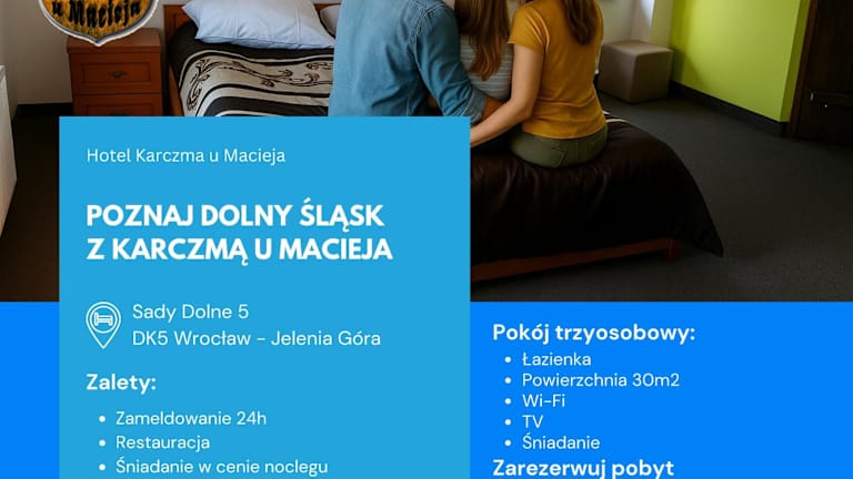 Das Hotel Karczma u Macieja in Bolków bietet Ihnen einen erholsamen Aufenthalt in einem grünen Viertel der Stadt. Genießen Sie die Annehmlichkeiten wie das große Restaurant, den Außenpool mit künstlichem Strand und das kostenfreie WLAN. Die klassisch eingerichteten Zimmer bieten Ihnen Komfort und Privatsphäre. Nutzen Sie die 24-Stunden-Rezeption, den Garten und die Terrasse des Hotels. Kostenlose Parkplätze stehen zur Verfügung. Die Burg Bolków und das Schloss Fürstenstein sind nur eine kurze Fahrt entfernt.