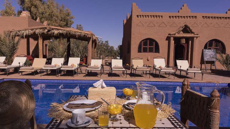 Im Restaurant des Kasbah Sahara können die Gäste regionale Köstlichkeiten aus frischen Produkten vom Markt genießen. Die Terrasse und der Speisesaal bieten eine angenehme Atmosphäre, um die Mahlzeiten zu genießen und den Blick auf die umliegende Landschaft zu genießen.