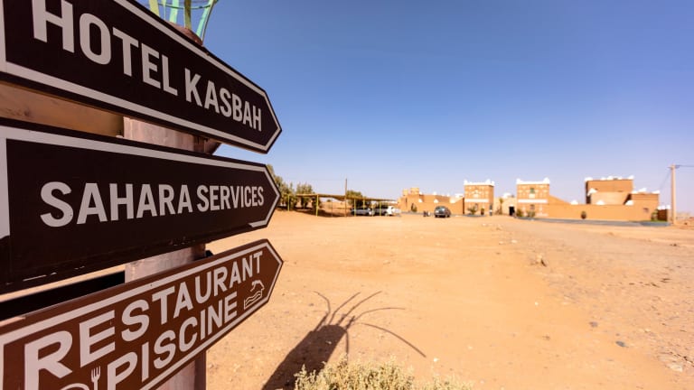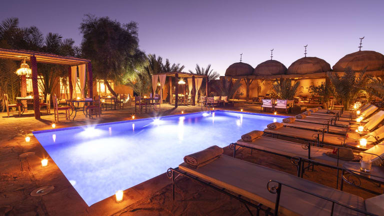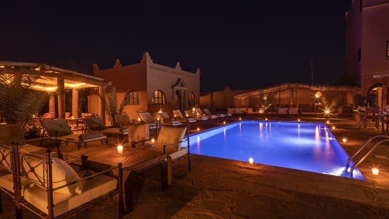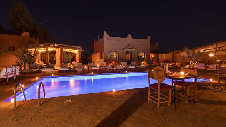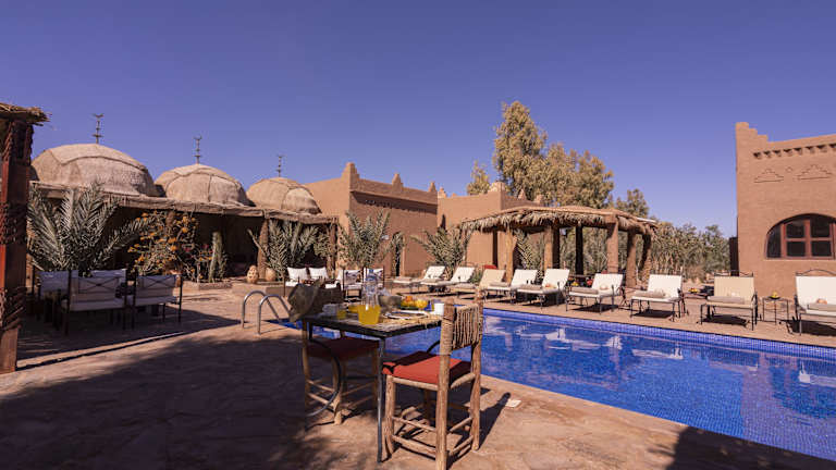 Das Hotel Kasbah Sahara in M'hamid El Ghizlane ist ein traditionelles Berber-Hotel, das den Gästen einen authentischen Aufenthalt in Marokko bietet. Mit klimatisierten Zimmern, einem schönen Garten und einer Terrasse können Sie die Ruhe und Schönheit der Umgebung genießen. Das hoteleigene Restaurant serviert köstliche regionale Gerichte, die auf der Terrasse oder im Speisesaal eingenommen werden können. Das Hotel bietet auch eine Vielzahl von Aktivitäten an, darunter 4x4- und Quadfahren in den Sanddünen sowie Camping- und Kamelreiten.