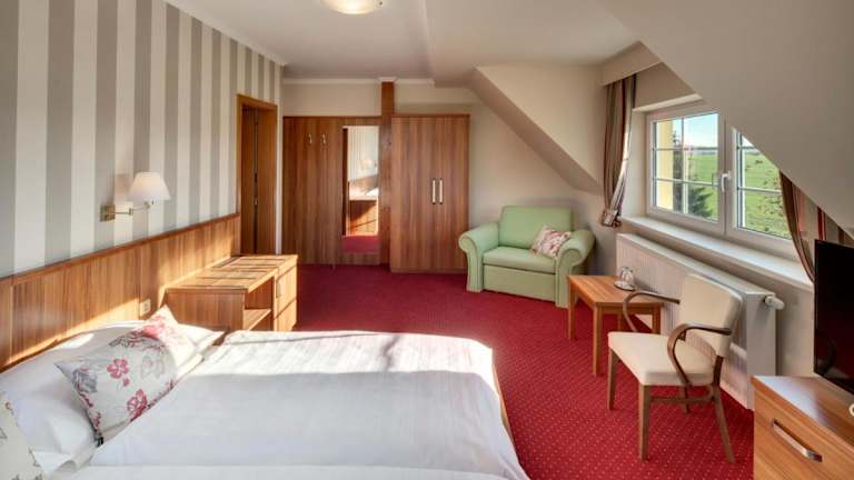 Die Zimmer im Hotel Kolonie bieten einen herrlichen Blick auf die umliegende Natur und sind gemütlich eingerichtet, um den Gästen einen angenehmen Aufenthalt zu ermöglichen. Jedes Zimmer verfügt über einen Sitzbereich mit Sofa und einen TV, so dass Sie sich nach einem ereignisreichen Tag entspannen können. Die Unterkünfte verfügen auch über ein eigenes Badezimmer mit Dusche und Haartrockner.
