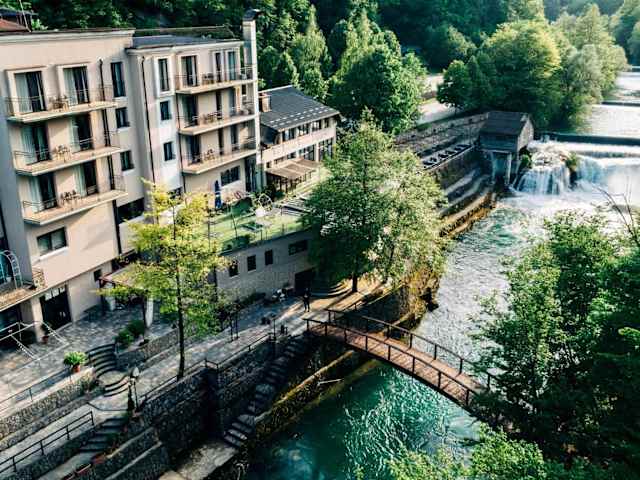 Das Hotel Kostelski Buk in Kostela, nur 8 km von Bihać entfernt, bietet Ihnen eine elegante Unterkunft inmitten unberührter Natur. Direkt an den Wasserfällen der Una gelegen, können Sie hier die Schönheit der Umgebung genießen. Das Hotel verfügt über eine Bar und ein Restaurant, in dem Sie traditionelle bosnische Spezialitäten sowie internationale Gerichte probieren können. Die modernen Zimmer sind klimatisiert und mit Annehmlichkeiten wie einem Flachbild-TV und einer Minibar ausgestattet. Einige Zimmer verfügen auch über einen Balkon. Das Hotel bietet zudem einen Wäsche- und Bügelservice sowie einen Safe an der Rezeption. Unternehmen Sie einen Ausflug in den nahegelegenen Una-Nationalpark oder lassen Sie sich von den Mitarbeitern des Hotels eine Rafting-Tour auf dem Fluss Una organisieren. In der Nähe befinden sich auch die Plitvicer Seen in Kroatien. Entdecken Sie auch die Sehenswürdigkeiten von Bihać, wie den Kapitänsturm und die vielen lokalen Restaurants. Der internationale Flughafen Zagreb ist 150 km entfernt.