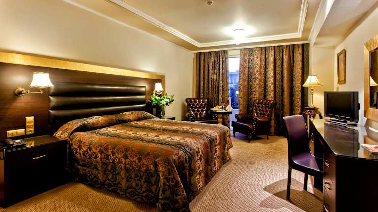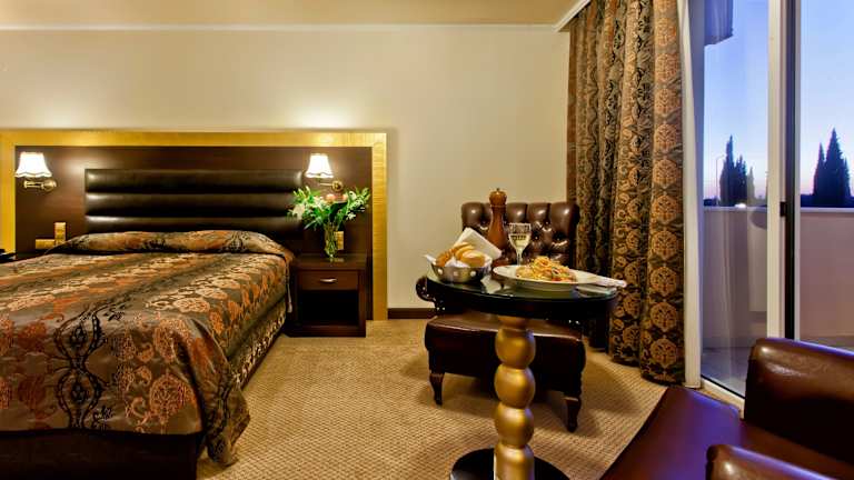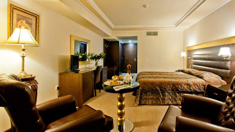 Die Zimmer und Suiten im Kouros Hotel sind klassisch eingerichtet und bieten den Gästen einen komfortablen Aufenthalt. Jedes Zimmer verfügt über einen Balkon mit Blick auf den Pool, den Garten oder die Berge. Die Zimmer sind mit Teppichböden, Vorhängen und klassischen Möbeln ausgestattet. Zur weiteren Ausstattung gehören eine Minibar, ein Flachbild-Sat-TV, ein Safe und ein Haartrockner. Kostenloses WLAN ist ebenfalls verfügbar.