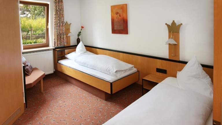 Die Zimmer im Hotel Krone sind komfortabel eingerichtet und verfügen über ein eigenes Badezimmer mit einem Haartrockner. Von den Zimmern aus haben Sie einen schönen Blick auf die umliegenden Berge, der zum Entspannen und Genießen einlädt.