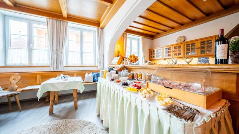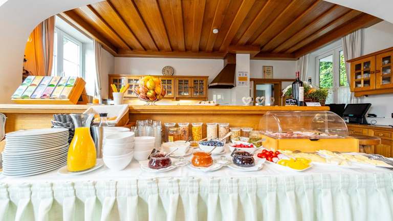 Jeden Morgen wird den Gästen ein kostenfreies Frühstück serviert. Das Frühstück im Hotel Krug bietet eine Vielzahl von Optionen, darunter verschiedene Gebäcksorten, Aufschnitt, Käse, hausgemachte Marmeladen, getrocknete Früchte, frisches Obst und Gemüse, Porridge, Müsli, Nüsse sowie frisch zubereitete Eierspeisen auf Bestellung.