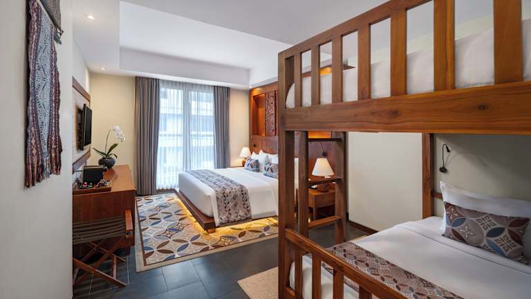 Das Kuta Seaview Boutique Resort bietet 80 Zimmer auf 3 Etagen, die mit einem Aufzug erreichbar sind. Jedes Zimmer ist im balinesischen Stil eingerichtet und verfügt über einen eigenen Balkon. Zur Ausstattung gehören ein 42-Zoll-Flachbild-Kabel-TV, eine Minibar, ein Safe und Tee- und Kaffeezubehör. Das Badezimmer ist mit einer Badewanne und einer Dusche ausgestattet. Kostenloses WLAN steht in allen Bereichen des Resorts zur Verfügung.