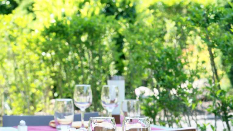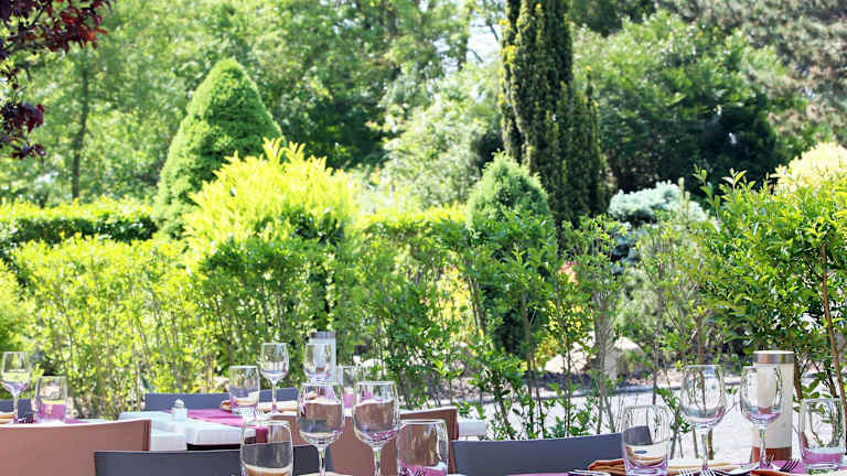 Auf der Terrasse des Hotels können Sie das schöne Wetter genießen und sich entspannen.