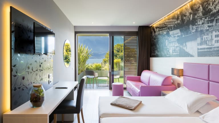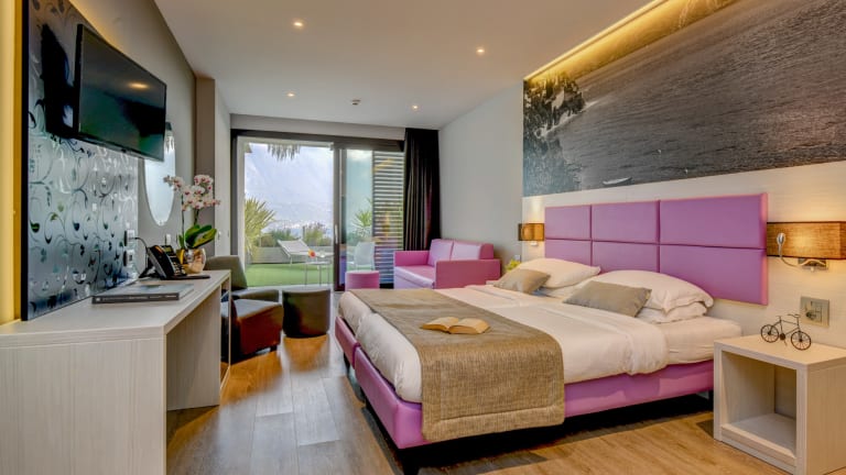 Bei der kompletten Umgestaltung des Hotels haben wir beschlossen, die Größe der Zimmer in den Vordergrund zu stellen, damit unsere Gäste nun alle Annehmlichkeiten und den Komfort genießen können, den man sich heutzutage im Urlaub wünscht: WLAN, Klimaanlagen, Balkone oder Terrassen, Schallisolierung, ein geräumiges Badezimmer mit komfortabler Dusche. Jede Etage ist ab sofort mit dem Aufzug zu erreichen, was nun auch älteren Gästen sowie Personen mit Behinderungen ermöglicht, ohne Schwierigkeiten alle Hotelbereiche zu erreichen. Es gibt den einen oder anderen Unterschied zwischen den Gästezimmern, hauptsächlich ist es die Verfügbarkeit eines Balkons bzw. einer Terrasse oder der See- bzw. Berg-/Seitenblick. Es gibt auch einige besonders geräumige Zimmer (Suiten) für höchsten Komfort sowie einige Zimmer, bei denen wir das Design und Mobiliar von dem bisherigen Hotel übernommen haben und in den kommenden Jahren separat modernisieren werden. Unten finden Sie eine detaillierte Übersicht über die verschiedenen Zimmer, die wir mit den Namen einiger Blumen benannt haben, da die Flora in unserem Hotel eine Schlüsselrolle spielt, wie auch der Hotelname bereits verrät.
