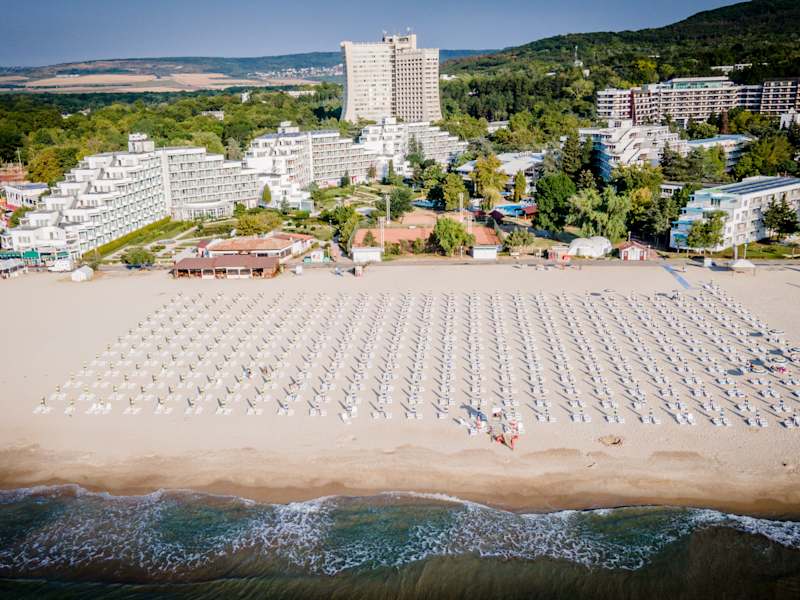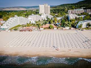 Das 4‑Sterne‑Hotel Laguna Garden befindet sich im Zentrum des Ferienortes Albena, nur ca. 150 m vom langen, feinsandigen Strand entfernt. Es liegt am Anfang der autofreien Promenade mit zahlreichen Geschäften, Restaurants und Freizeitmöglichkeiten – ideal für Urlauber, die zentral wohnen möchten. Die Hotelanlage bietet einen Außenpool mit mineralhaltigem Wasser, ein Kinderbecken mit Rutche und großzügige Liegebereiche. Ein reservierter Strandabschnitt ab der 3. Reihe mit Sonnenschirm und 2 Liegen pro Zimmer ist im Preis inbegriffen. Das Green All Inclusive-Paket umfasst alle Mahlzeiten in Buffetform, Snacks sowie lokale Getränke von 10:00 bis 23:00 Uhr. Es gibt Themenabende, Show-Cooking und bei Aufenthalten über 7 Nächte ein Dine-Around-Programm (außerhalb der Hochsaison). Das Hotel ist Teil des „Sports Around®“-Programms – Gäste können viele Sportarten kostenlos ausüben: Beachvolleyball, Tischtennis, Wassergymnastik, Darts, Badminton, Aerobic und mehr. Gegen Gebühr: Tennisplätze, Reiten, Wassersport, Fitness, Minigolf, Schwimm- und Surfschule. Insgesamt stehen im Resort über 100 Sporteinrichtungen zur Verfügung. Laguna Garden ist ideal für Familien, Paare und aktive Urlauber, die Albena in zentraler Lage mit Nähe zum Meer, Unterhaltung und Sport genießen möchten.