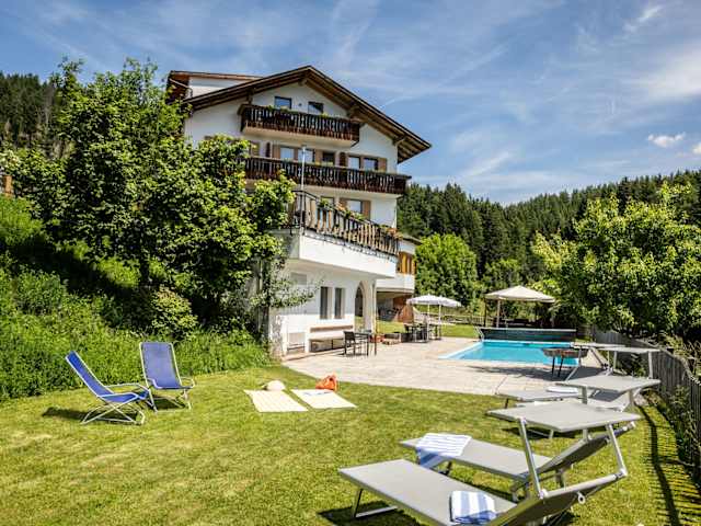 Für pure Entspannung nach einem erlebnisreichen Tag sorgt unser Freibad mit großzügiger Liegewiese und traumhaftem Blick auf die Dolomiten. Ob eine erfrischende Abkühlung an warmen Sommertagen oder einfach nur die Seele baumeln lassen – hier finden Sie Ihre ganz persönliche Wohlfühloase. Die ruhige Lage unseres Hauses und die gemütlichen Zimmer bieten Ihnen einen Rückzugsort zum Erholen.