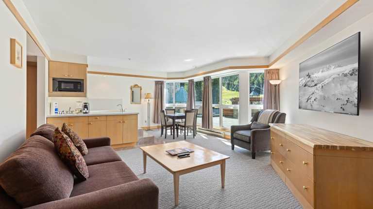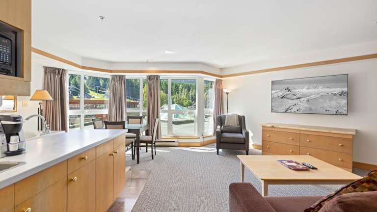 Das Hotel Le Chamois by Whistler Premier befindet sich in einer idealen Lage in Whistler, direkt an der Skipiste am Fuße des Blackcomb Mountain. Dies ermöglicht einen einfachen Zugang zu den Pisten und eine atemberaubende Aussicht auf die umliegende Berglandschaft. Das Scandinave Spa ist nur 4 km entfernt und bietet eine entspannende Oase für alle, die sich nach einem Tag auf den Pisten erholen möchten. Das Whistler Village, mit seinen vielen Geschäften, Restaurants und Unterhaltungsmöglichkeiten, ist nur 5 Gehminuten entfernt und bietet eine vielfältige Auswahl an Aktivitäten für alle Gäste.