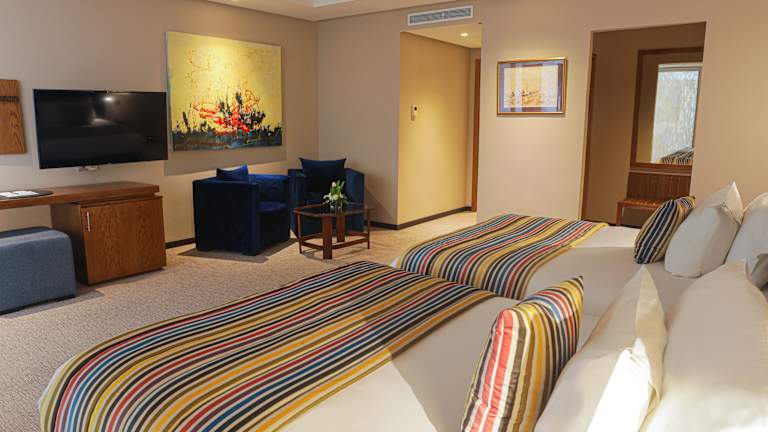 Die Zimmer sind modern und stilvoll eingerichtet, verfügen über ein Wohnzimmer, eine Wohnung und ein Badezimmer und sind mit Klimaanlage, Heizung sowie Teppichböden ausgestattet. Viele Zimmer bieten einen Balkon oder eine Terrasse. Zur Ausstattung gehören Doppelbetten, Minibar, Schreibtisch, Telefon, Sat-TV sowie kostenloses WLAN. Die Badezimmer sind mit Dusche oder Badewanne, Haartrockner und Kosmetikartikeln ausgestattet. Es sind auch spezielle, rollstuhlgerechte Zimmer verfügbar.