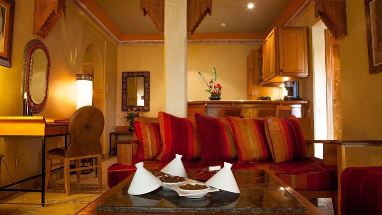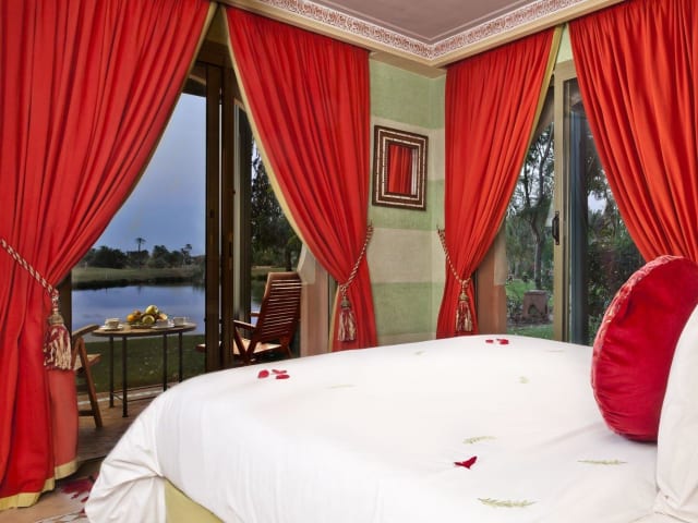 Die eleganten Apartments im Pavillon du Golf - Palmeraie suites bieten geräumige Unterkünfte mit einem Balkon, von dem aus Sie einen Panoramablick auf den Golfplatz und das Atlasgebirge genießen können. Die klimatisierten Apartments sind geschmackvoll eingerichtet und verfügen über Sat-TV und ein eigenes Bad.