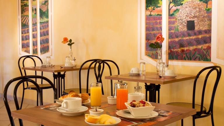 Im Restaurant des Hotels können Sie traditionelle französische Küche genießen. Starten Sie Ihren Tag mit einem kontinentalen Frühstück, das Ihnen täglich im Speisesaal oder auf der Terrasse serviert wird. Hier können Sie die authentische Atmosphäre der Region erleben und sich kulinarisch verwöhnen lassen. Ein separater Sitzbereich mit einem TV steht Ihnen ebenfalls zur Verfügung, falls Sie sich entspannen und einen Film oder Ihre Lieblingssendung genießen möchten.
