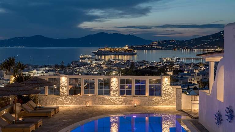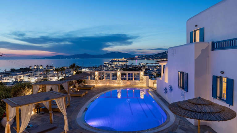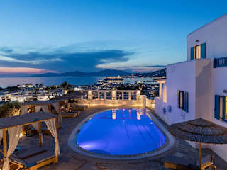 Das Marisso Hotel liegt auf einem Hügel mit Blick auf die malerische Hauptstadt von Mykonos. Der internationale Flughafen von Mykonos ist nur 3 km entfernt und der Hafen von Mykonos nur 1 km. Der Sandstrand von Megali Ammos ist nur 1 km entfernt und der Strand Platys Gialos 4 km. Die Lage des Hotels bietet Ihnen die Möglichkeit, die Schönheit der Insel Mykonos zu erkunden und die Strände zu genießen.
