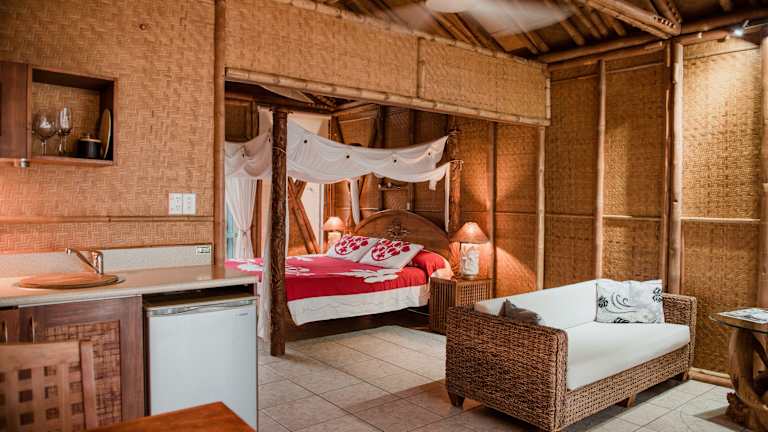 Das Magic Reef Resort bietet 9 geräumige Bungalows im Studio-Stil, die alle im polynesischen Stil gestaltet sind. Jeder Bungalow verfügt über ein komfortables Himmelbett und eine Küchenzeile, in der Sie Ihre eigenen Mahlzeiten zubereiten können. Alle Bungalows bieten zudem einen möblierten Balkon mit Meerblick, wo Sie den Sonnenuntergang genießen können. Ein besonderes Highlight ist die private Außendusche und Badewanne, die ein echtes tropisches Erlebnis bietet. Alle Bungalows sind mit einem 32-Zoll-Smart-TV mit Netflix ausgestattet und bieten unbegrenztes kostenfreies WLAN.