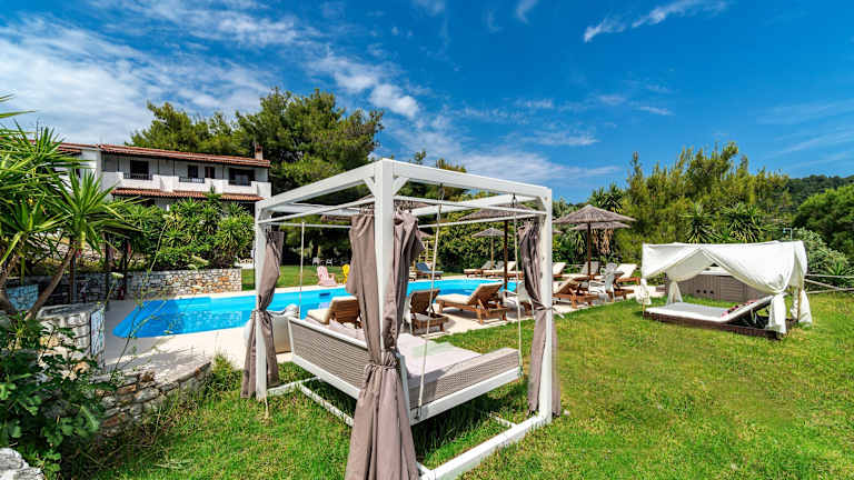 Das Margi House ist eine wunderschöne Unterkunft, umgeben von Olivenbäumen, Pinien und Gärten, die Ihnen einen unvergesslichen Blick auf das Meer bietet. Freuen Sie sich auf den Außenpool und den Whirlpool im Freien, in denen Sie sich entspannen können. Die Studios zur Selbstverpflegung sind kürzlich renoviert worden und bieten modernen Komfort wie kostenloses WLAN und einen LCD-TV. Von den großen Balkonen aus können Sie den atemberaubenden Meerblick genießen. Die Lage des Hotels ist ideal, nur 5 km vom Hafen und der Stadt Skiathos entfernt, wo Sie eine Vielzahl von Bars und Restaurants finden. Der Strand ist nur 7 Gehminuten entfernt und in der Nähe des Margi House gibt es auch ein Wassersportzentrum.