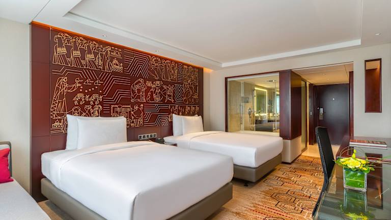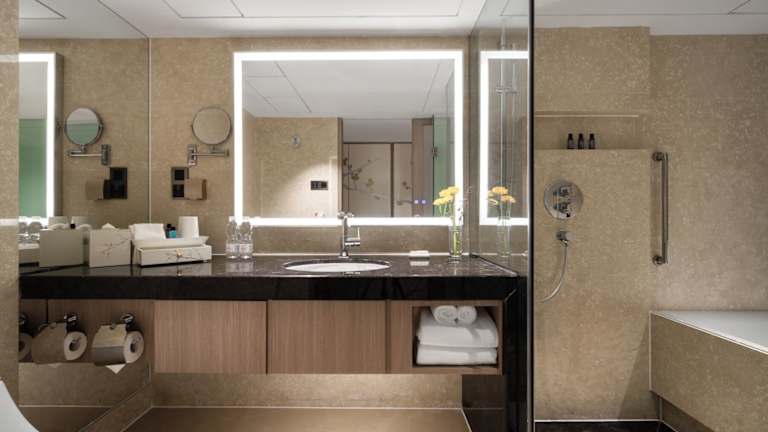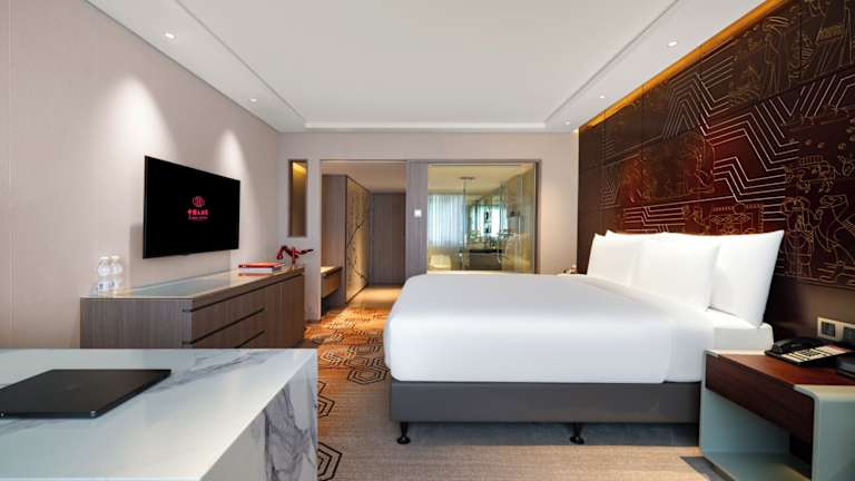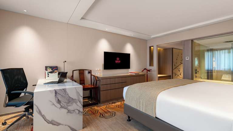 Die Zimmer im China Hotel, A Marriott Hotel sind elegant eingerichtet und verfügen über Palisander-Vertäfelungen und einen Flachbild-TV. Ein Luftreinigungssystem sorgt für frische Luft im Raum. Die Badezimmer sind geräumig und bieten eine separate Regendusche und eine Badewanne.