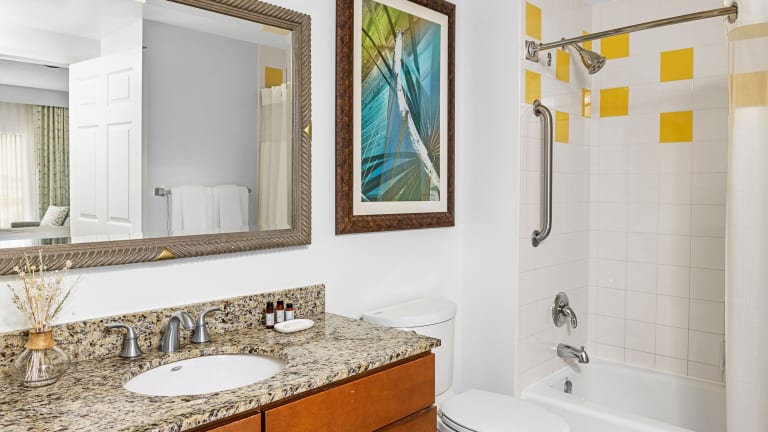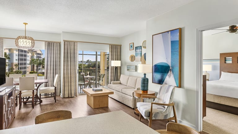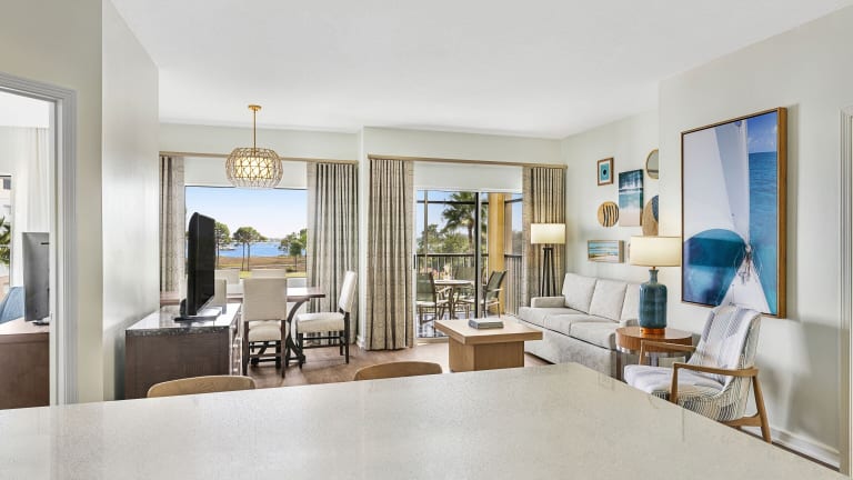 Die geräumigen und schallisolierten Zimmer im Marriott's Legends Edge at Bay Point sind mit modernem Komfort ausgestattet. Jedes Zimmer verfügt über ein gemütliches Wohnzimmer mit Sofa und Kabel-TV sowie eine voll ausgestattete Küche mit Mikrowelle, Geschirrspüler und Herd. Die Küchen bieten viel Stauraum und einen Arbeitsbereich. Genießen Sie den Komfort und die Annehmlichkeiten dieser gut ausgestatteten Zimmer.