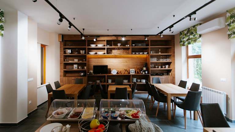 Die Gäste haben die Möglichkeit, ein Frühstück in Buffetform zu genießen. Des Weiteren steht eine Gemeinschaftsküche zur Verfügung, in der die Gäste sich selbst verpflegen können.