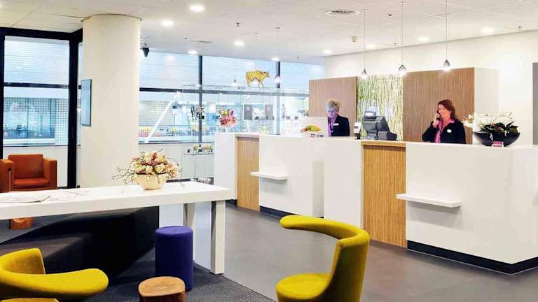 Das Hotel Mercure Schiphol Terminal befindet sich in der Lounge 3 des Flughafens Schiphol, gegenüber der KLM Crown Lounge. Um zum Hotel zu gelangen, begeben Sie sich zur Abflughalle 3, passieren die Zollkontrolle und wenden sich nach rechts. Das Hotel liegt im Sicherheitsbereich des Flughafens, auf der 1. Etage zwischen den Gates E und F.