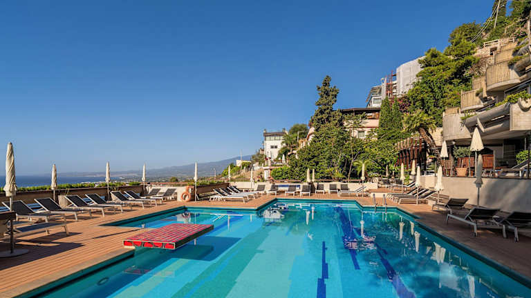 Das Hotel Monte Tauro befindet sich in Taormina, terrassenförmig an einem Hang erbaut mit Blick auf die Naxosbucht und den Ätna. Der Zugang zum Hotel erfolgt über einen steilen Weg. Zum Corso Umberto, der Haupteinkaufsstraße, sind es etwa 5 Gehminuten, zur Seilbahnstation ungefähr 15 Minuten. Öffentliche Tennisplätze und der Stadtpark sind nur ca. 2 Minuten entfernt. Ein Shuttle zum Strand "Lido Tropicana" ist saisonal gegen Gebühr verfügbar. Der Strand mit Kies ist privat und flach abfallend. Entfernungen: Flughafen Catania ca. 65 km, Strand ca. 5 km, Stadtzentrum Taormina ca. 250 m, Giardini Naxos ca. 6 km.