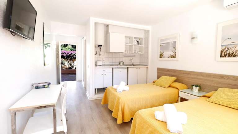 Die Apartments und Studios im Apartamentos y Estudios Naika sind hell und geräumig. Jede Unterkunft verfügt über einen Sitzbereich mit Sat-TV und eine komplett ausgestattete Küchenzeile mit Elektroherd, Kühlschrank und Toaster. WLAN nutzen Sie kostenfrei in den Studios und den öffentlichen Bereichen des Hotels Gabarda, das nur 250 m entfernt liegt.