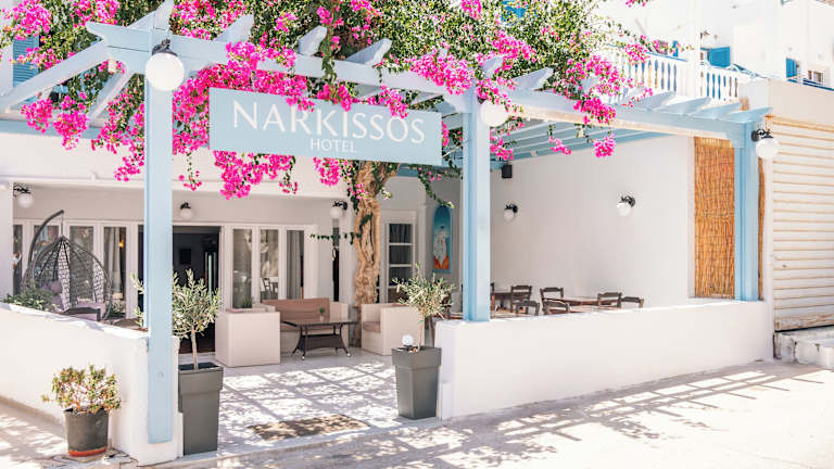 Verbringen Sie einen erholsamen Urlaub im Narkissos Hotel in Kamari auf Santorin. Das Hotel befindet sich nur wenige Schritte vom schwarzen Sandstrand entfernt und bietet komfortable Zimmer mit kostenfreiem WLAN. Genießen Sie das Frühstücksbuffet und speisen Sie im hoteleigenen Restaurant. Entspannen Sie auf der Terrasse oder in der Lounge und lassen Sie den Abend in der Hotelbar ausklingen. Die zentrale Lage des Hotels ermöglicht es Ihnen, Restaurants, Bars und Geschäfte bequem zu Fuß zu erreichen.