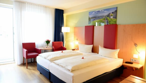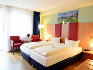 In den bequem eingerichteten Hotelzimmern (Einzelzimmer, Doppelzimmer, Zweibettzimmer, Dreibettzimmer) fühlt sich der Urlauber herzlich willkommen. Zu jedem Zimmer zählt ein Badezimmer. Zur Badeinrichtung gehören Badewanne oder Dusche, Kosmetikspiegel, Haartrockner und Toilettenartikel. Verfügbar sind auch eine Minibar, ein Safe und ein Schreibtisch. Eine Kaffeemaschine ist ins Zimmerinventar integriert. Zudem sind ein Telefon, ein Radio sowie ein Fernseher vorzufinden. In der Wohneinheit finden Sie eine Flasche Wasser. Allergikerzimmer sind auf Anfrage buchbar.