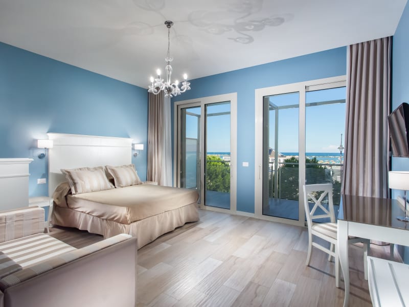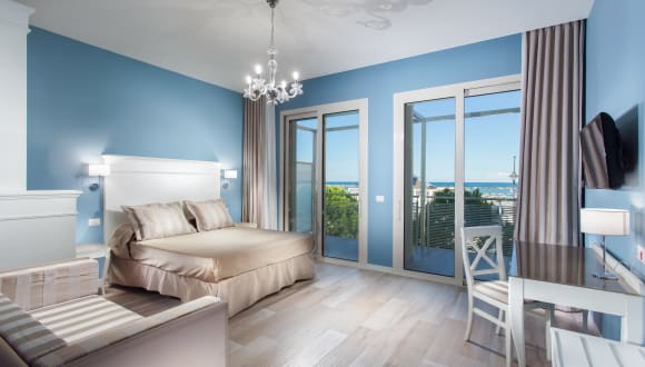 Die Zimmer im Hotel Nettuno sind elegant und modern eingerichtet. Sie sind in blauen Farbtönen gehalten und mit weißen Designermöbeln ausgestattet. Jedes Zimmer verfügt über einen Balkon, einen LCD-TV, einen Kühlschrank und ein modernes Badezimmer mit Haartrockner.