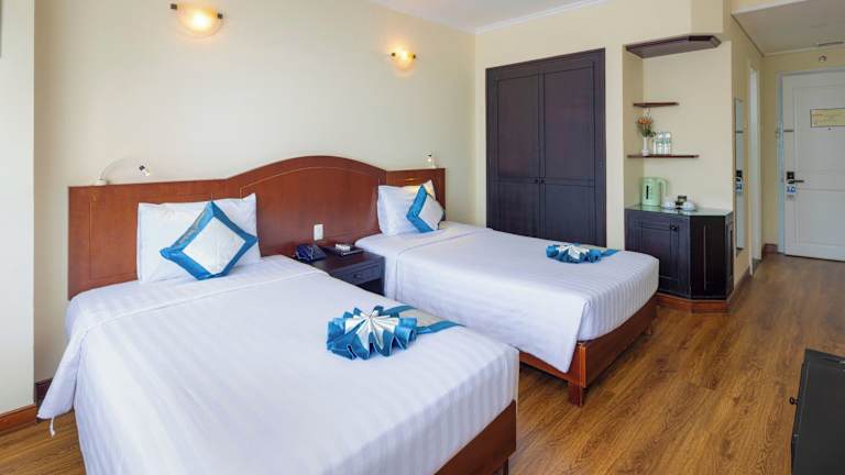 Das Nha Trang Lodge Hotel verfügt über 125 Zimmer, die sich auf 13 Etagen erstrecken. Die Zimmer sind über einen Aufzug erreichbar und bieten modernen Komfort. Sie sind komplett mit Teppichböden ausgestattet und verfügen über einen Flachbild-Kabel-TV, einen Balkon, einen Sitzbereich, eine Minibar und Pflegeprodukte. Einige Zimmer bieten auch einen Balkon mit Meerblick.