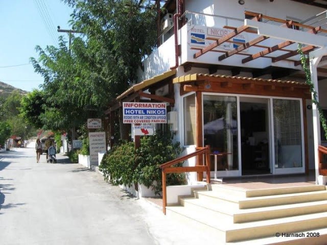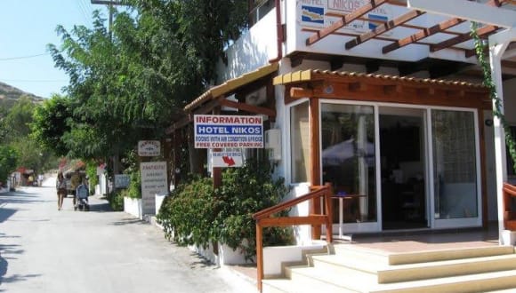 Das Familiegefuehrte Hotel Nikos ist gelegen in der Ortschaft Matala, nur 50m vom Strand entfernt. Alle Zimmer haben Klima-Anlage und verfuegen ueber ein Balkon/Veranda mit Blick auf den Garten des Hotels, oder mit Meerblick und Blick auf die beruehmten Hoehlen von Matala. Im Innenhof gibt es gemuetliche Ecken mit Tische und Stuehle, umgeben durch Baeume und Bluemen. Die Privatparkplaetze an der Unterkunft nutzen Sie kostenfrei.