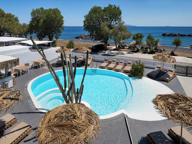 Buchen Sie das Nissia Beach Apartments & Suites in Kamari für einen unvergesslichen Urlaub am einzigartigen schwarzen Sandstrand von Santorin. Genießen Sie den atemberaubenden Ausblick auf das Ägäische Meer und erleben Sie eine entspannte Atmosphäre in diesem Boutique-Komplex. Entspannen Sie am Pool oder im Whirlpool und wählen Sie aus einer Vielzahl von Unterkunftsmöglichkeiten, die alle mit einer Küchenzeile, einem Kühlschrank und Klimaanlage ausgestattet sind.
