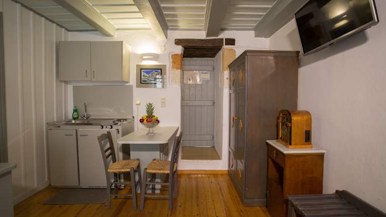 Das Nostos Hotel verfügt über 12 traditionell eingerichtete Zimmer, die den Gästen einen komfortablen Rückzugsort bieten. Jedes Zimmer ist mit modernen Annehmlichkeiten wie Klimaanlage, Kühlschrank und kostenfreiem WLAN ausgestattet. Einige Zimmer bieten auch einen herrlichen Blick auf den venezianischen Hafen. Die traditionelle Einrichtung verleiht den Zimmern eine gemütliche Atmosphäre.