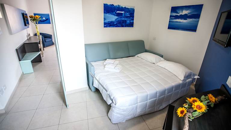 Die Zimmer im Hotel Oceanomare sind elegant und modern eingerichtet. Jedes Zimmer ist klimatisiert und verfügt über einen eigenen Balkon. Zur Ausstattung gehören ein Flachbild-TV, ein Schreibtisch und ein eigenes Bad mit einer Dusche oder einer Badewanne. Die Suiten und Junior Suiten bieten zusätzlich einen separaten Sitzbereich und sind besonders geräumig.