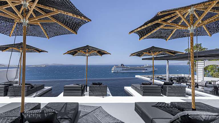 Im Tagoo Black Mykonos können Sie Ihr Frühstück am Pool mit Blick auf das Meer genießen. Die Poolbar lädt zum Entspannen ein und bietet eine Auswahl an erfrischenden Getränken. In der Umgebung des Hotels finden Sie auch eine Vielzahl von Restaurants und Bars, in denen Sie die lokale Küche und internationale Spezialitäten probieren können.