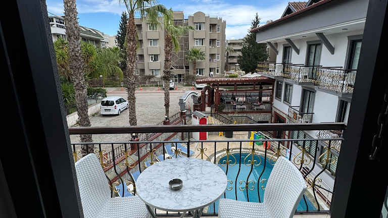 Das Apartmenthotel liegt etwa 1,2 km vom Sand- und Kieselstrand entfernt und nur ca. 600 m vom Zentrum von Kemer mit seinen zahlreichen Einkaufsmöglichkeiten, Bars und Restaurants. Die nächste Bushaltestelle ist etwa 850 m entfernt. Der Flughafen Antalya befindet sich in einer Entfernung von ungefähr 55 km.