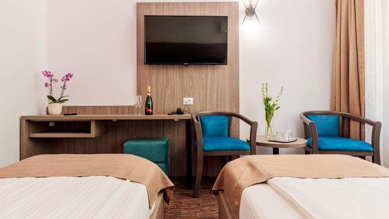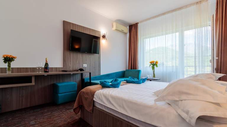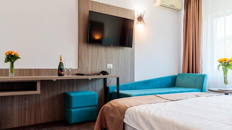 Hotel Orizont bietet eine umfassende Ausstattung, darunter ein kostenloser Privatparkplatz, ein Restaurant, eine Bar sowie kostenfreies WLAN. Die 24-Stunden-Rezeption sorgt für eine durchgehend besetzte Anlaufstelle für die Gäste. Der Wellness-Bereich beinhaltet einen Innenpool, eine Sauna, einen Whirlpool und ein türkisches Dampfbad, was den Aufenthalt zusätzlich komfortabel gestaltet.