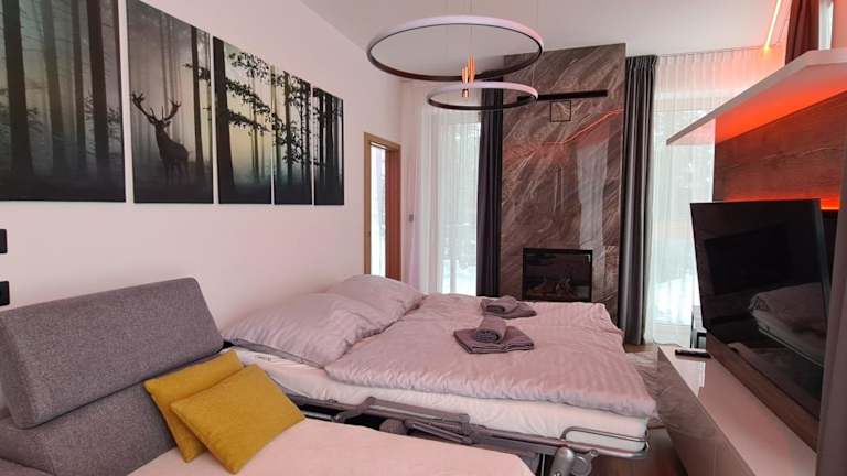 Das Hotel Ovruč - rodinný apartmán 111 liegt in Vysoké Tatry, nur 1 km vom malerischen See Strbske Pleso entfernt. Die Lage des Hotels bietet Ihnen die Möglichkeit, die Schönheit der Umgebung zu erkunden und die Natur hautnah zu erleben. In der Nähe finden Sie zahlreiche Wanderwege und Aktivitäten im Freien. Der Baumwipfelpfad ist ebenfalls in der Nähe und bietet einen einzigartigen Blick auf die umliegende Landschaft. Der Flughafen Poprad-Tatry ist bequem zu erreichen und bietet eine gute Anbindung an das Hotel.
