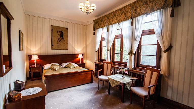 Das Pałac Myśliwski w Antoninie ist ein charmantes Bed & Breakfast in einem historischen Schloss, umgeben von einem malerischen englischen Garten. Genießen Sie den Aufenthalt in stilvoll eingerichteten Zimmern, die klassische Hartholzmöbel und kostenfreies WLAN bieten. Entspannen Sie im gemeinsamen Kaminzimmer oder im Club des Schlosses und lassen Sie sich von traditionellen polnischen Gerichten im hoteleigenen Restaurant verwöhnen. Das Pałac Myśliwski bietet außerdem eine Sauna und veranstaltet regelmäßig klassische Konzerte. Die ruhige Lage des Bed & Breakfasts ermöglicht es Ihnen, dem Trubel der Städte zu entfliehen und die Natur zu genießen.