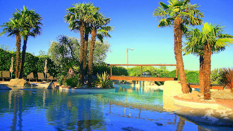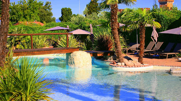 Das Hotel hat einen schönen Pool, der von einem üppigen grünen Garten umgeben