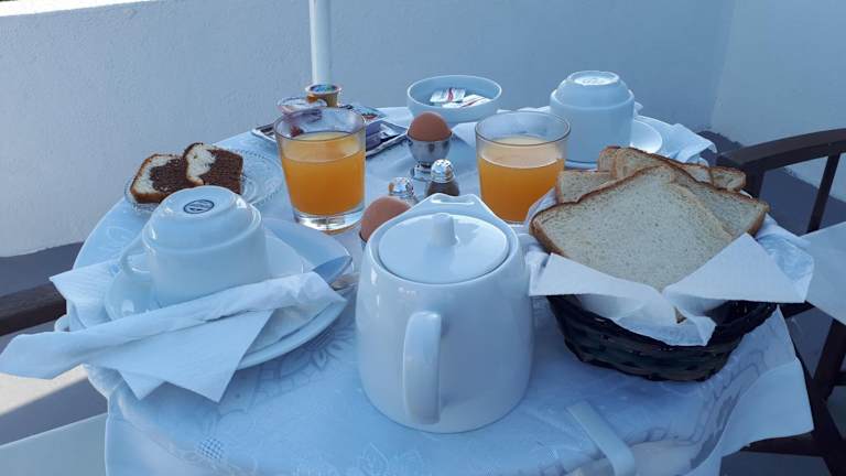 Das Hotel bietet ein tägliches Frühstück, das auf dem Zimmer serviert wird. Das Frühstück umfasst Kaffee, Kuchen, Brot und Marmelade und sorgt für einen guten Start in den Tag. In den charmanten Gassen von Oia finden Sie eine große Auswahl an Restaurants und Cafés, in denen Sie lokale Spezialitäten und internationale Küche genießen können.