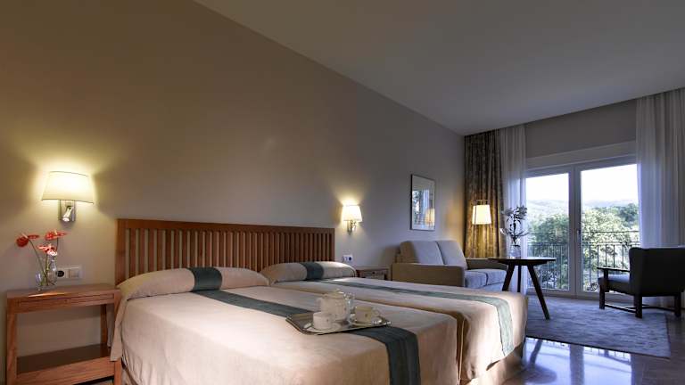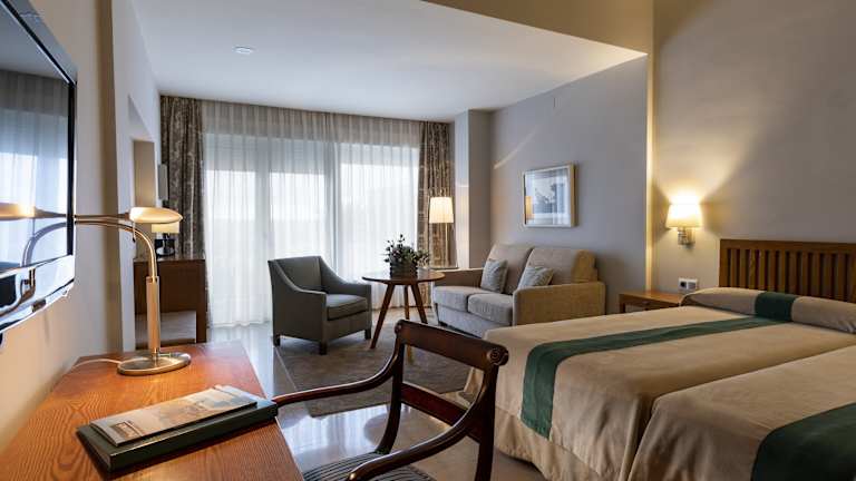 Die Zimmer im Hotel Parador de Cordoba sind geräumig und elegant gestaltet. Sie verfügen über Klimaanlage, Heizung, Balkon oder Terrasse sowie ein Queensizebett und ein Sofabett. Weitere Annehmlichkeiten sind ein Safe, eine Minibar, ein Schreibtisch, ein Minikühlschrank, ein Bügelset, ein Telefon, ein TV-Gerät, ein Steckdosenadapter sowie kostenfreies WLAN. Die Badezimmer sind mit Dusche und Badewanne ausgestattet; Haartrockner und Telefon sind ebenfalls vorhanden. Es sind rollstuhlgerechte Zimmer verfügbar.