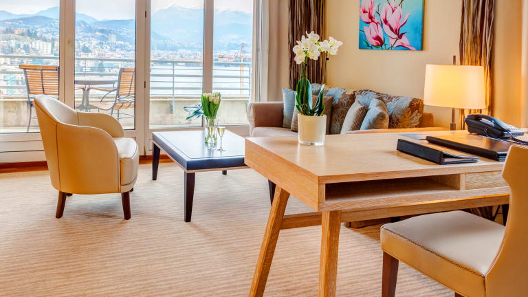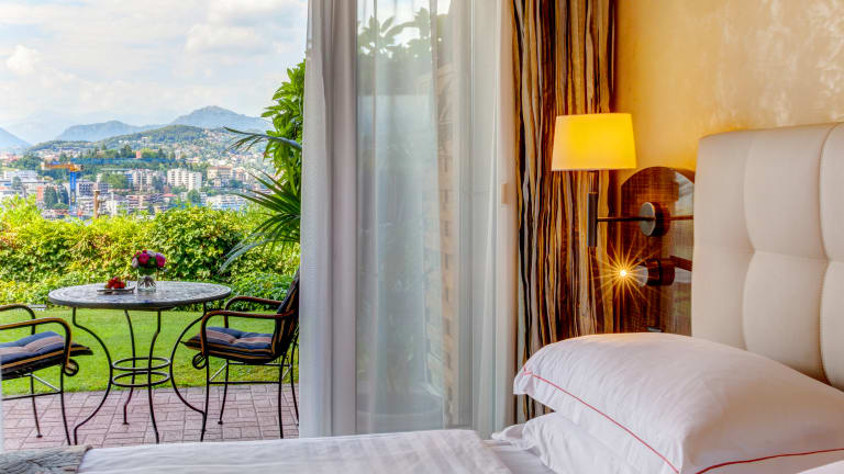 65 grosszügige Zimmer und Suiten (23-75 m2) mit Seeblick oder Gartenblick, alle mit Balkon oder Terrasse, Klimaanlage verfügbar
