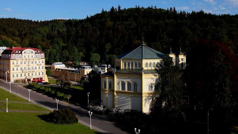 Das Hotel Paris liegt im Zentrum von Marienbad, nur 50 Meter von der Singenden Fontäne auf der Kolonnade entfernt. Diese zentrale Lage ermöglicht es den Gästen, die Sehenswürdigkeiten der Stadt bequem zu erkunden.