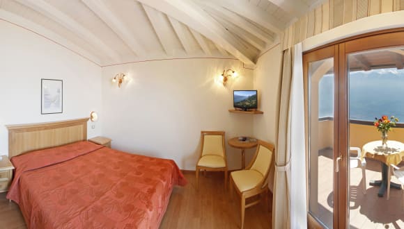Das Hotelmanagement empfängt Sie herzlich in den komfortabel eingerichteten Zimmern, Juniorsuiten, Suiten, Appartments und Ferienhäusern. Das Hotel verfügt über 74 Zimmer (teils mit Seeblick, teils mit Bergblick, mit Balkon oder Terrasse, Kat. standard, superior u. deluxe, mit allem Komfort ausgestattet ( Telefon, TV-Sat, Safe, Föhn. Kühlschrank ( nur in der Kat. superior) Klimaanlage (teilweise) Wifi. Restaurant, Bar, Panoramaterrasse, Hallenbad mit Kinderbecken, Freibad mit Liegen und Sonnenschirmen, Whirlpool, Shiatsu-Massagesessel.