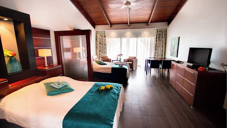 Das Resort bietet eine Vielzahl von Zimmern, darunter Nichtraucherzimmer, Junior-Suiten und Suiten. Jedes Zimmer verfügt über eine Klimaanlage, einen Ventilator und einen Balkon oder eine Terrasse mit Meerblick. Die Zimmer sind komfortabel und stilvoll eingerichtet und bieten den Gästen eine erholsame Atmosphäre.