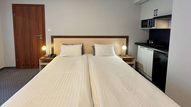 Das Hotel verfügt über 77 Zimmer, die mit Klimaanlage, Balkon, Safe, Kühlschrank, Tee- und Kaffeemaschine, Telefon, TV und WLAN ausgestattet sind. Die Badezimmer verfügen über eine Dusche, eine Badewanne, einen Haartrockner und Kosmetikartikel. Rollstuhlgerechte Zimmer sind ebenfalls verfügbar. Es gibt Familien-, Nichtraucher- und Raucherzimmer zur Auswahl.