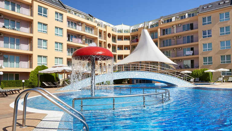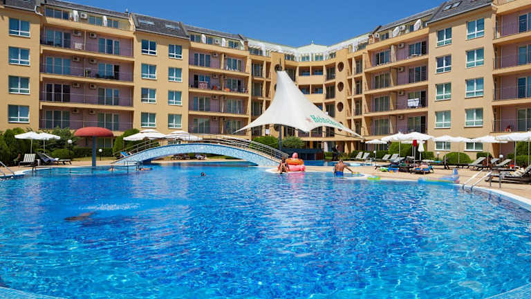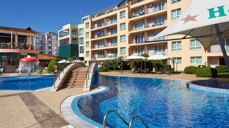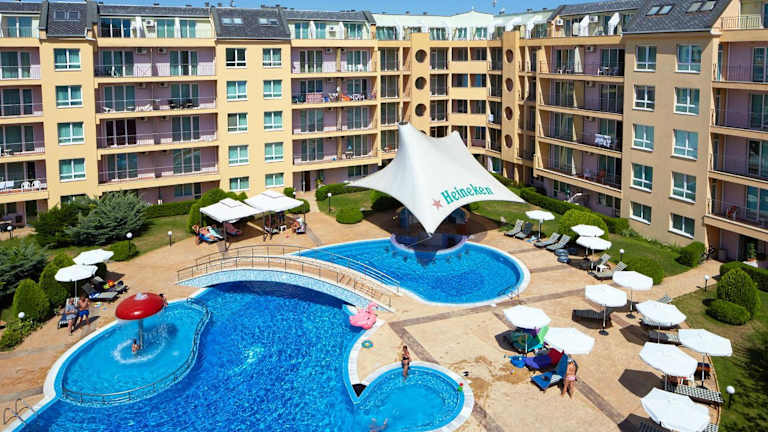 Das Pollo Resort liegt im südlichen Teil des Sonnenstrands, nur 300 Meter vom Strand und dem beliebten Club Cacao entfernt. Diese günstige Lage ermöglicht es den Gästen, die Schönheit des Strandes und das aufregende Nachtleben in unmittelbarer Nähe zu erleben. Eine Bushaltestelle befindet sich nur 50 Meter vom Resort entfernt und bietet gute Verbindungen zur antiken Stadt Nessebar und zum Zentrum des Sonnenstrands. Der Flughafen von Burgas ist etwa 30 km entfernt und gut mit dem Pollo Resort verbunden.